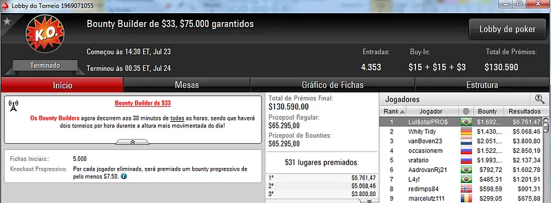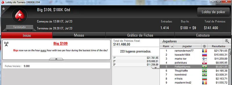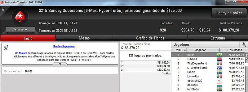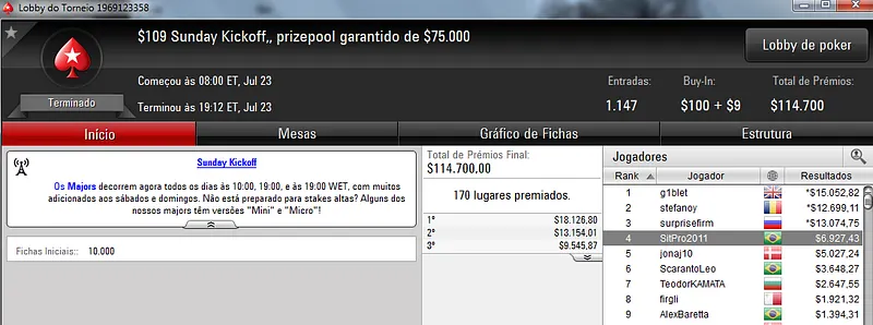 O grande vencedor da reta foi Pedro "peterwhooo" Correa que terminou o $700 Super-Sized Sunday na segunda colocação recebendo $37,553. Este torneio teve a participação de 601 jogadores que fizeram o prize pool chegar aos $399,665. Destaque ainda para Regis "capotinha" Kogler que terminou na 4ª posição e recebeu $16,342. Já SitPro2011 faturou $8,655 pelo 7º lugar.