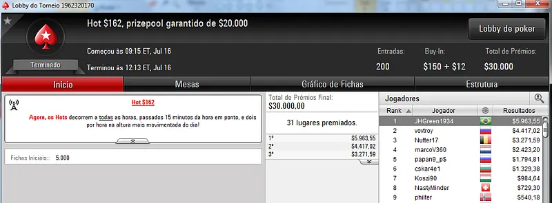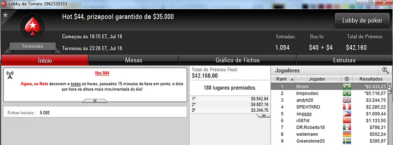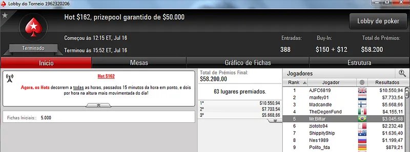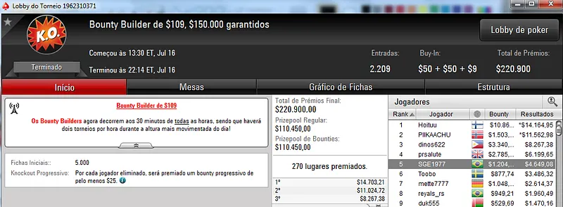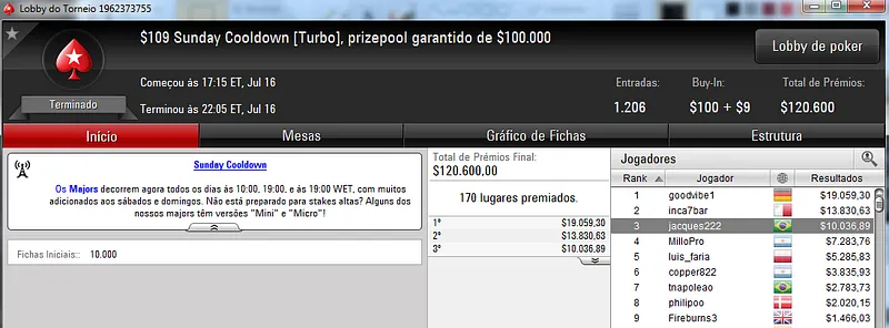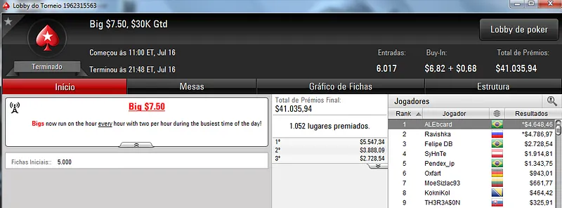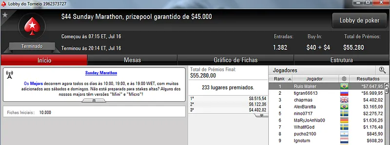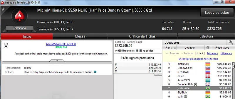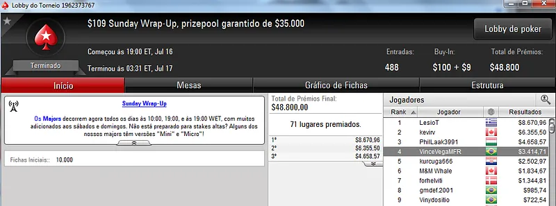 O melhor brasileiro foi TILTADO_BR que terminou o Mini Sunday Million com 9,400 jogadores na segunda colocação. O jogador brasuca apenas foi parado por matthew123ku da Polônia levando para o caixa $17,277 de premiação.