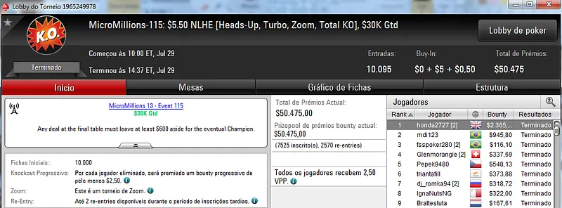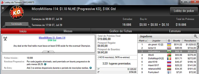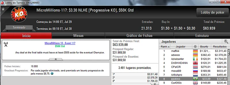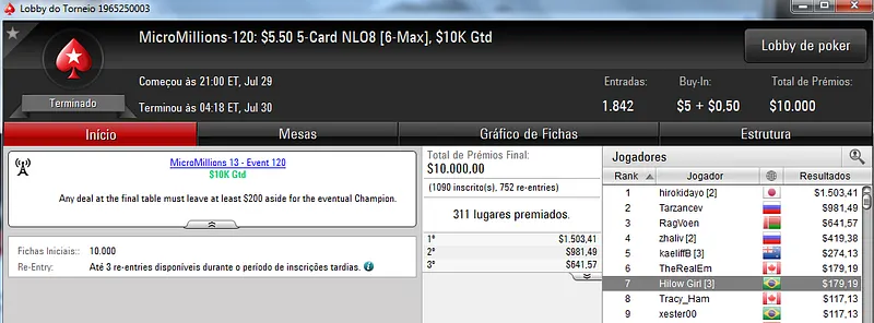 Já no MicroMillions #119: $1,10+R NLHE [6-Max, Bubble Rush] com 7,239 entradas, seudanado e guiertel terminaram na segunda e terceira colocação, respectivamente. O torneio foi vencido pelo japonês bokunenjin e seudanado recebeu $2,362. Já guiertel forrou $1,515 de premiação.