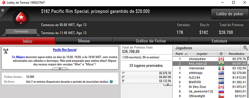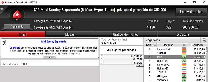 Já no $215 Sunday Supersonic com 981 jogadores, Victor "vitinhorrn15" Pedote também terminou an segunda colocação para forrar $21,455. TranBrothers do Vietname ficou com o título.