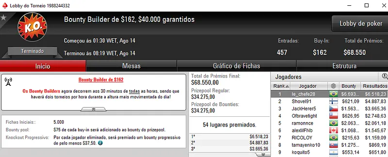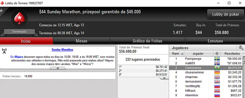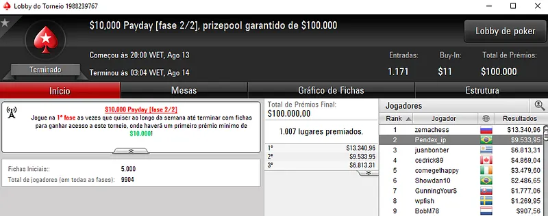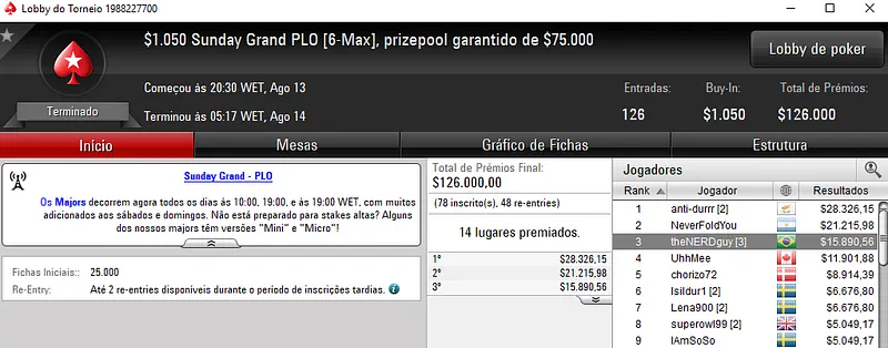 Fabiano "kdrAS" Teixeira também fez bonito no $215 Sunday Warm-Up com 1,539 jogadores. O jogador brasuca faturou $33,780 depois de apenas perder no heads-up para o finlandês elmerixx.