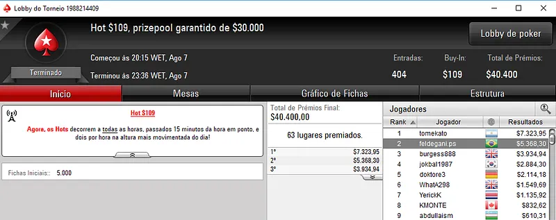 O $215 Monday 6-Max teve a participação de 431 jogadores e o prize pool chegou aos $86,200. Na segunda colocação dantegoyaF forrou $10,019 depois de chegar a acordo no heads-up. O jogador brasileiro apenas foi batido por O.G.Pageka que levou $13,430 de prêmio.