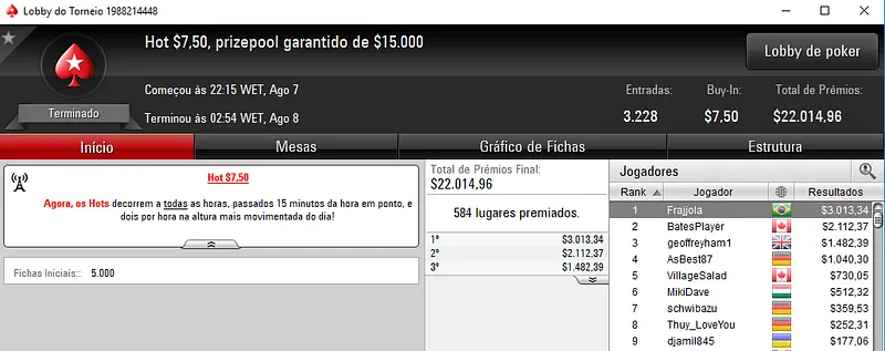 Luiz Antônio "Giant_Santos" Constantino voltou a aprontar no PokerStars. Desta vez foi no Hot $215 com 222 oponentes. O jogador brasileiro saiu com o título e $8,721 de premiação.