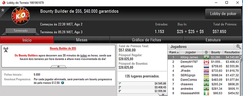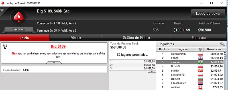 Douglas "Dowgh-Santos" Ferreira também se deu no Big $55 e cravou $8,272 depois de vencer outro brasuca no heads-up. Mathaus 500 saiu na segunda colocação e embolsou $5,864 de premiação. O torneio teve 1,093 registos e o prize poll chegou aos $54,650.