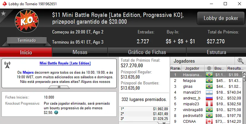 Quem deu show no $109 Battle Royale [Late Edition, Progressive KO] foi dilimAA que cravou o torenio com 748 jogadores e levou para casa $10,744. O torneio teve um prize pool acumulado de $74,800 que foi distribuído pelos 98 melhores classificados.