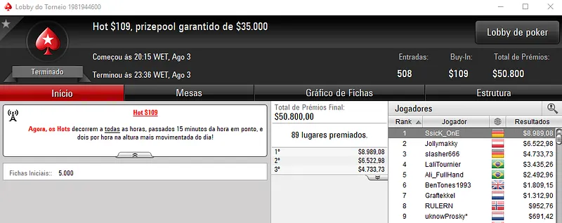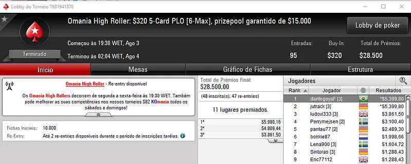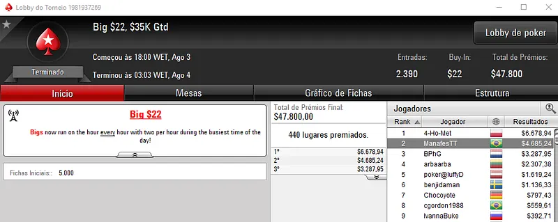 Este torneio teve 398 participantes e o prize pool de $79,600 foi distribuído pelos 55 melhores classificados. A mesa final ainda contou com ais mais dois jogadores brasileiros. Duim foi quinto e recebeu $4,210, enquanto AfranioMM levou $2,275 pelo sétimo lugar.