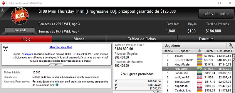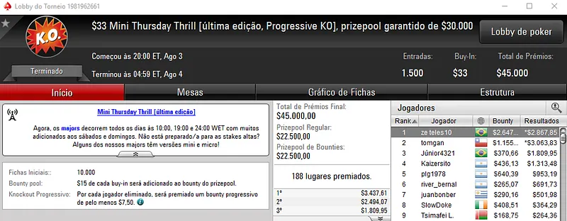 O mesmo AfranioMM terminou o $320 Thursday Thrill na segunda colocação e embolsou mais $10,878 de prêmio. O torneio contou com 326 entradas e o jogador brasuca apenas foi passado por Pokerjoke909 da Alemanha.
