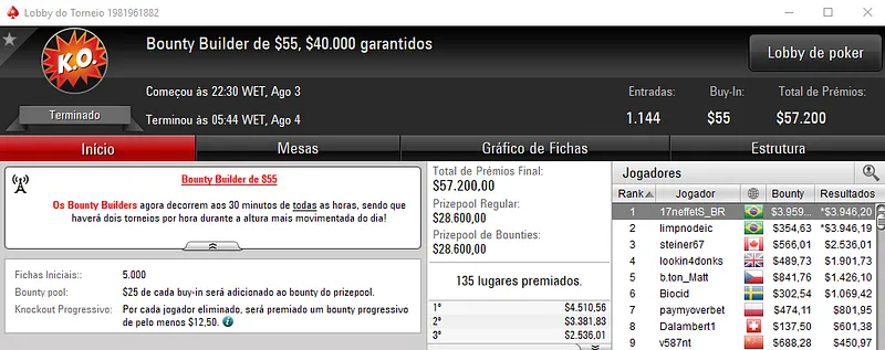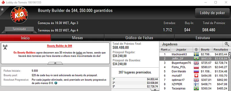 O Bounty Builder $33 contou com 2,606 jogadores e viu um brasuca sambar. S.totuli faturou $8,871 depois de cravar o torneio que teve um prize pool de $78,180.