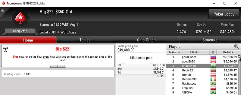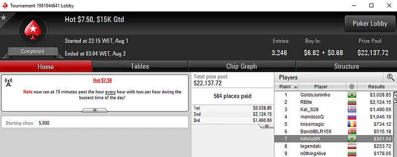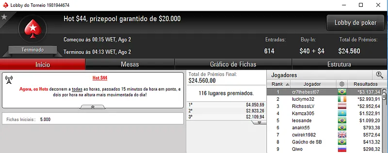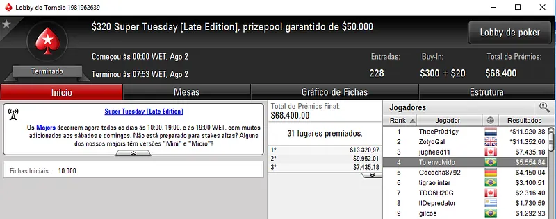 Foi o que aconteceu com Gustavo "gustavo5454" Hoffmann que foi vice no $1050 Super Tuesday com 339 entradas e $339,000 de prize pool. Os prêmios foram distribuídos pelos 47 melhores jogadores e o nosso representante conseguiu sair com uma forra de $52,567, depois de chegar a acordo no heads-up. SpaceyFCB do Reino Unido ganhou o título e $57,000.