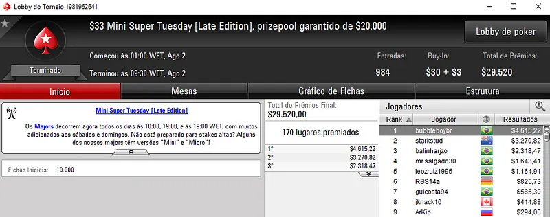JúlioFantin também ficou no pódio. Desta vez foi no $109 Mini Super Tuesday onde foram registados 1,241 jogadores. O jogador brasuca levou para o caixa $10,140 e viu na posição anterior, C.K. embolsar $7,290 pela 4ª colocação.