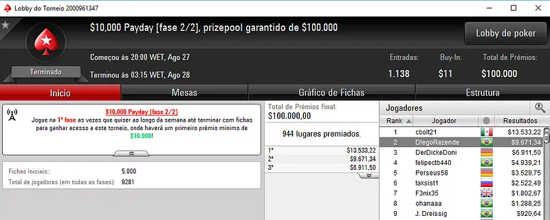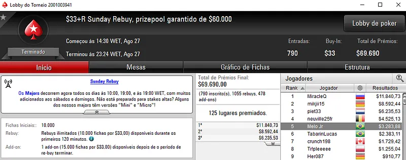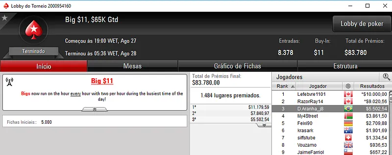 Quem também se deu bem foi Victor "vitinhorrn" Pedote que terminou o $215 Sunday Supersonic na terceira colocação. A medalha de bronze valeu $17,053 ao jogador brasileiros, depois de realizar acordo com os outros dois finalistas.