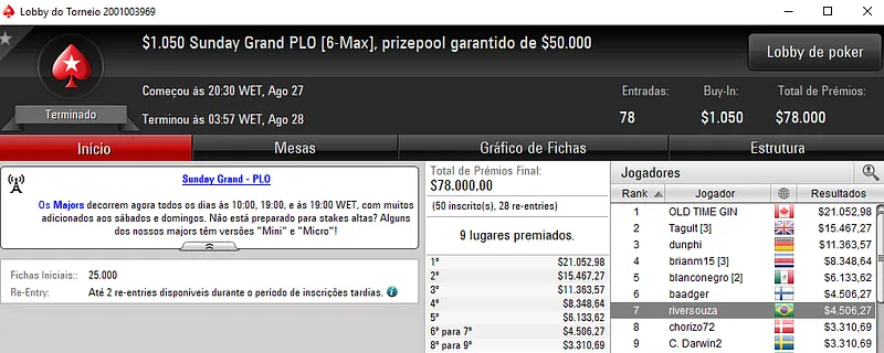 Ricardo "riversouza" Souza foi um desses grinders que conseguiu forrar pesado na reta de ontem. Ele terminou o $215 Sunday Warm-Up com 1,316 jogadores na segunda colocação. Depois de realizar acordo no heads-up, o jogador brasileiro garantiu $34,237 de premiação. Ainda na mesa final deste torneio, Alisson "heyallison" Piekazewicz foi sétimo colocado e recebeu $6,261.