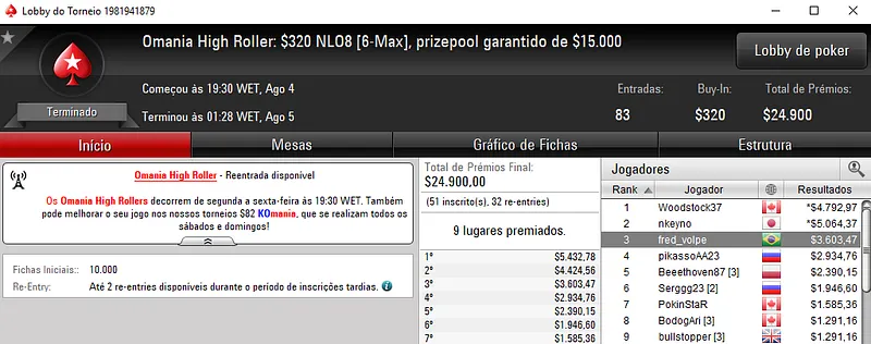 Já pawlinho encaixou $5,529 ao terminar na segunda colocação o Big $109 com 419 jogadores. O jogador brasileiro apenas foi superado por King Leonov da Bélgica.