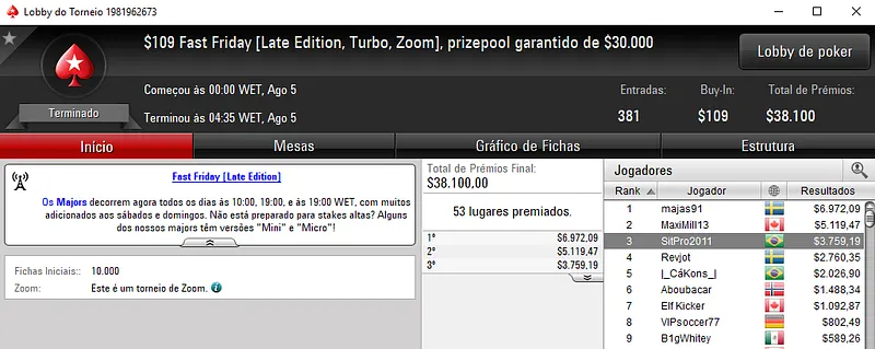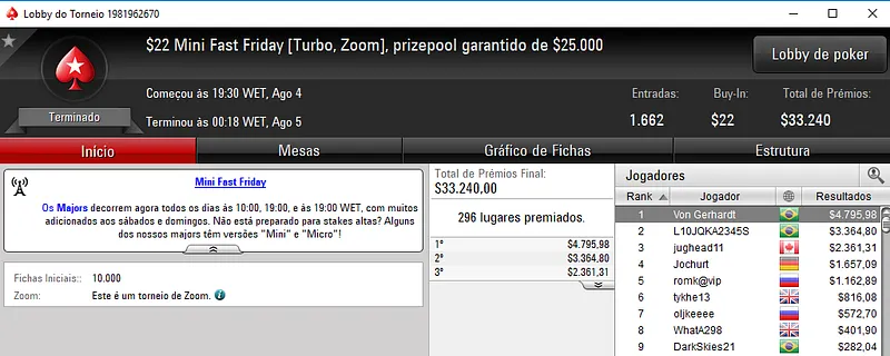 Sexta-feira também é dia de ação na maior sala de poker online do mundo e mais uma vez tivemos bons resultados nos panos virtuais.