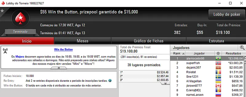 O craque Caio Pessagno também fez bonito e cravou o Hot $55 com 777 jogadores e $38,850 de prizepool. Pelo título, Pessagno encaixou $6,273. Na segunda colocação, hmuller35 levou para casa $4,487 de premiação.