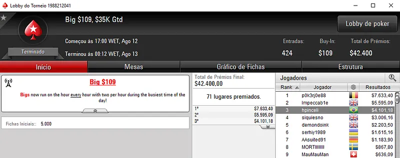 O jogador brasuca amc1304 foi quem trouxe o maior prêmio na reta de ontem do PokerStars. O $215 Saturday Scuffle contou com 435 entradas e noto topo da classificação amc1304 cravou $17,320 entre prêmios e bounties.