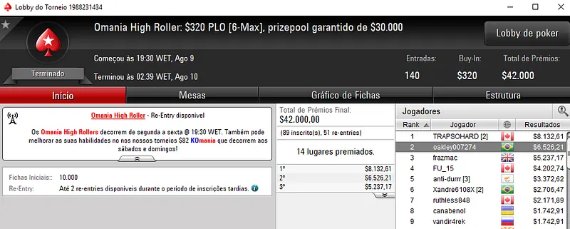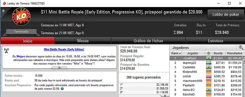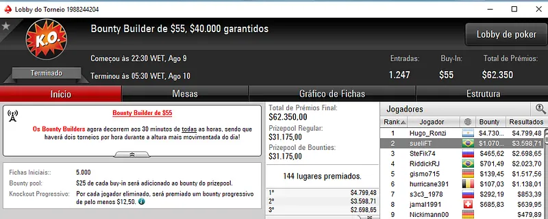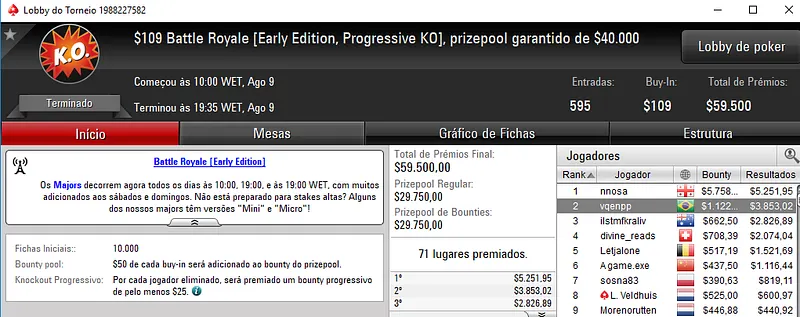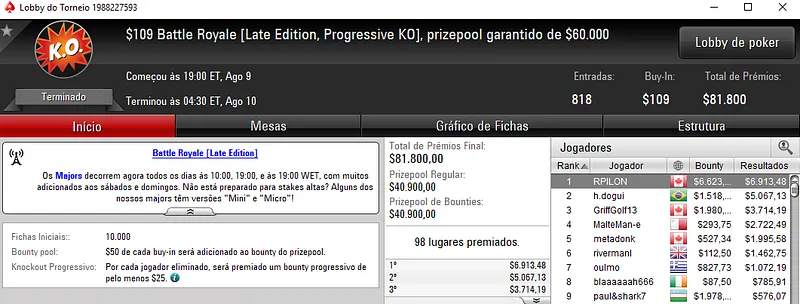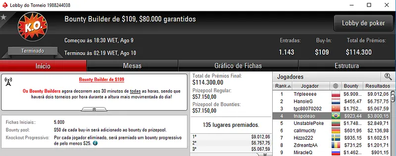 O grande vencedor da reta foi ZéDoBlefe11 que recebeu $10,601 no Big $109. Este torneio contou com a presença de 611 jogadores e o prizepool chegou aos $61,100.