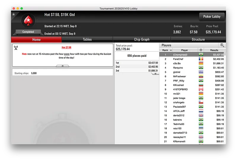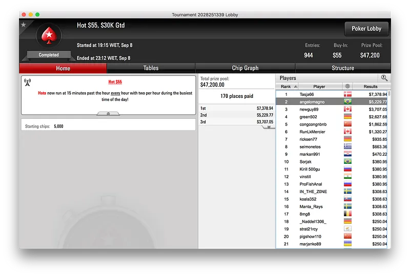 artur145 bateu os 2.485 jogadores que se registraram para jogar o Hot $22 e embolsou a maior fatia do prize pool total de $49.720. No final, artur145 bateu Dudmansio (2º - $4.873) e adicionou $6.946 na conta.
