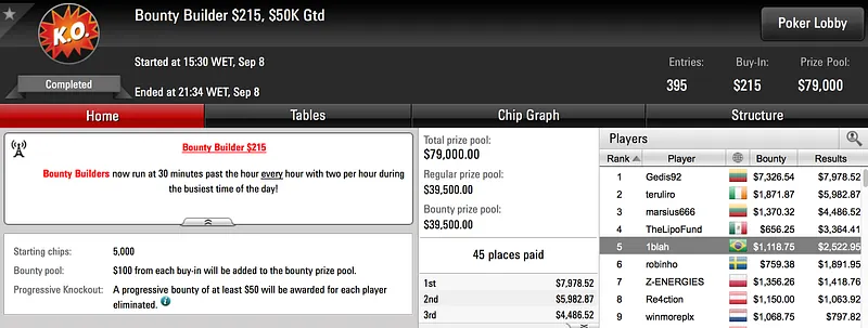 Em destaque ficou ArielBahia que se sagrou vice-campeão do $215 Fast Friday tendo embolsado $10.797. Ariel quase batia o field de 336 entradas mas, acabou por cair aos pés de Mikensonas (1º - $10.921) mas não antes de chegar a um acordo que praticamente dividia o prémio em disputa por partes iguais.