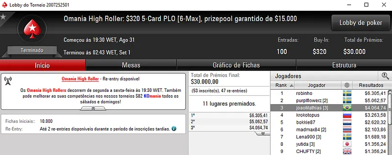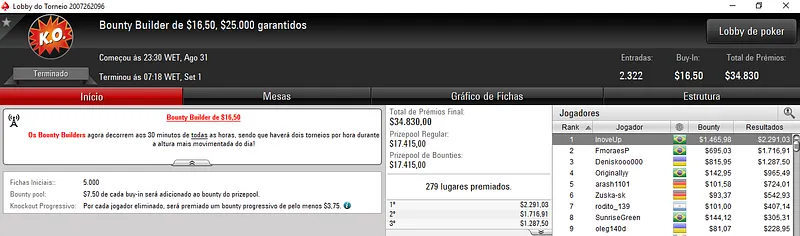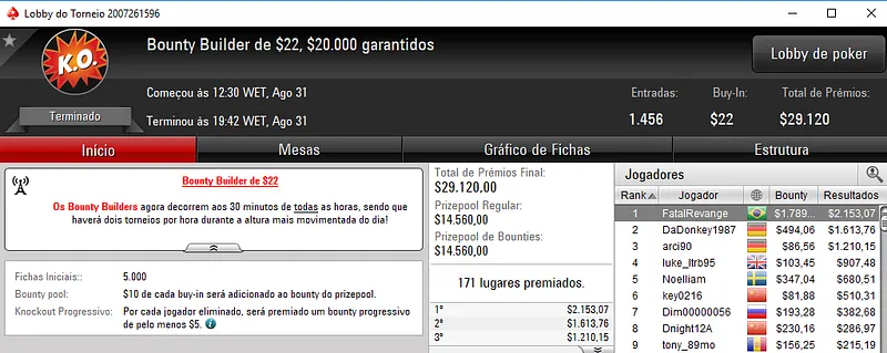 Já Guilherme "Anao19" Schreiber cravou o Bounty Builder $215 com 388 jogadores. O jogador brasuca sobrepôs-se a todo o field e encaixou $17,390 de premiação.