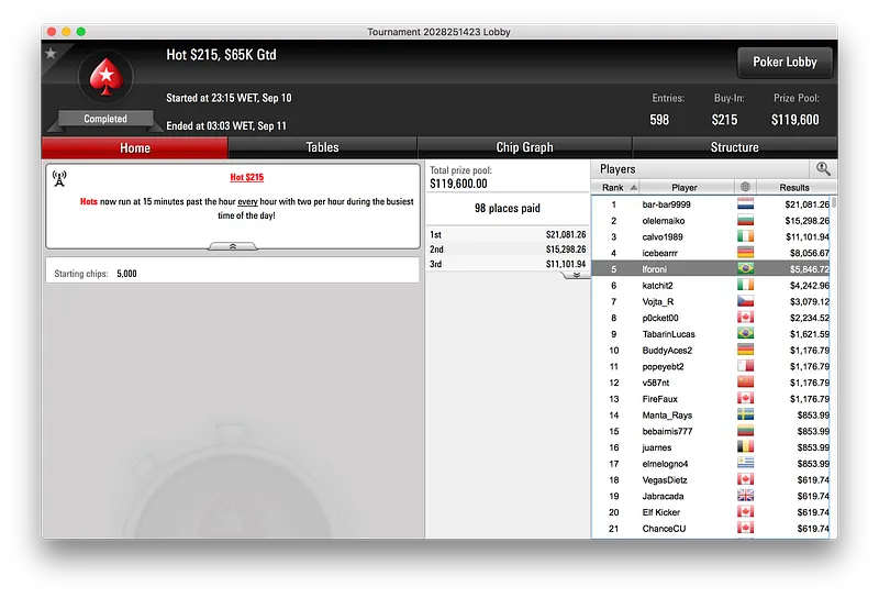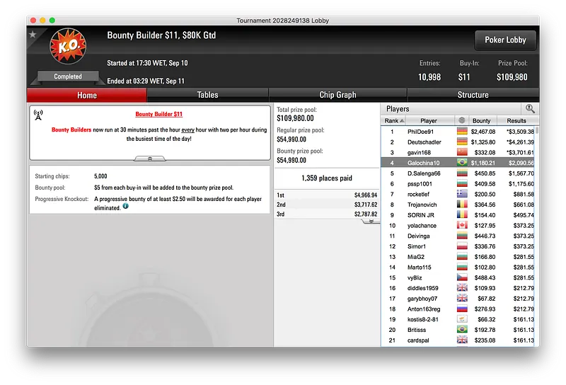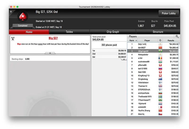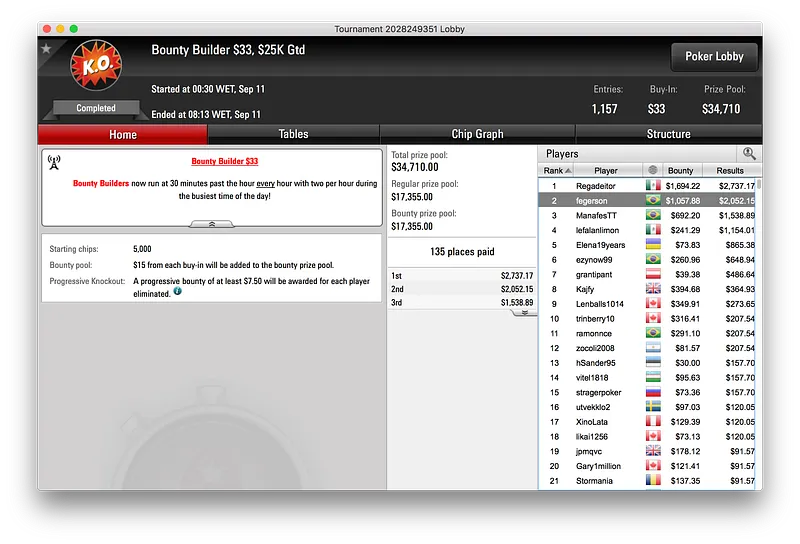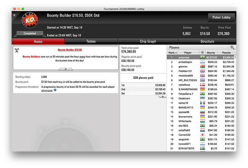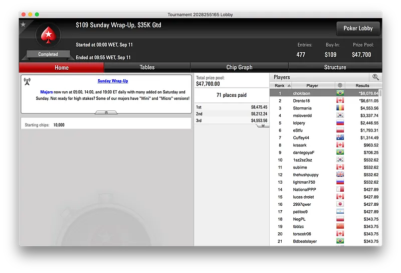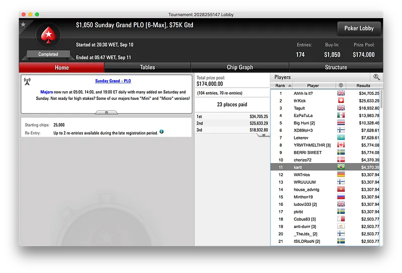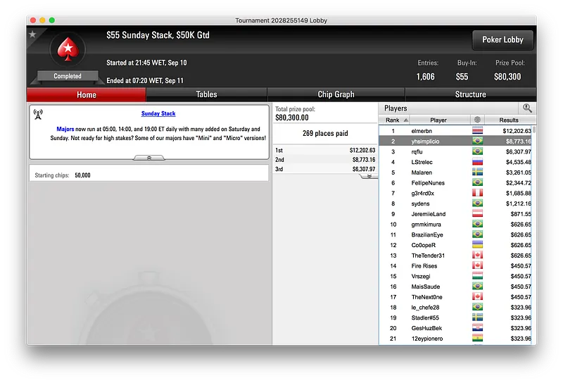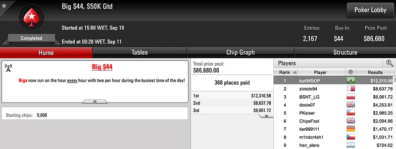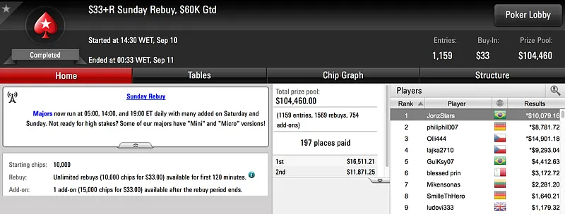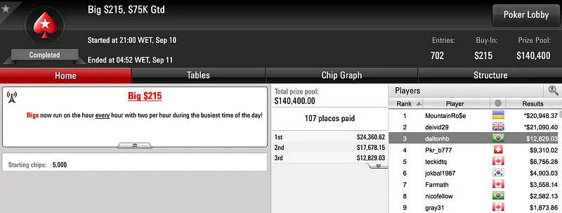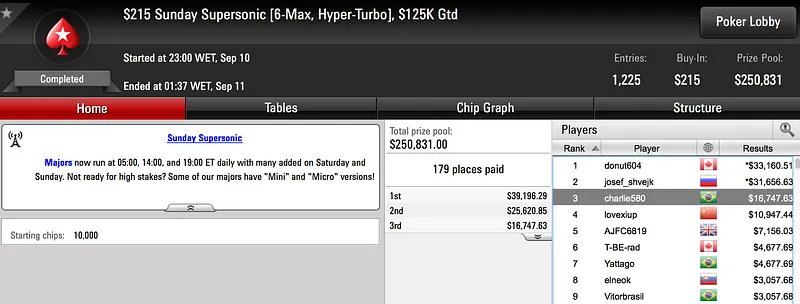 O maior de todos veio do $700 Super-Sized Sunday onde Lorenzo "charlie580" Bazei foi vice-campeão e recebeu $38.332 pela sua prestação. O único jogador que conseguiu derrotar Bazei foi o Canadiano "apestyles" que acabou embolsando $82.417. A mesa final contou ainda com a presença de mais dois Brasileiros, PLF111 (7º - $10.466) e oakley007274 (8º - $8.849).