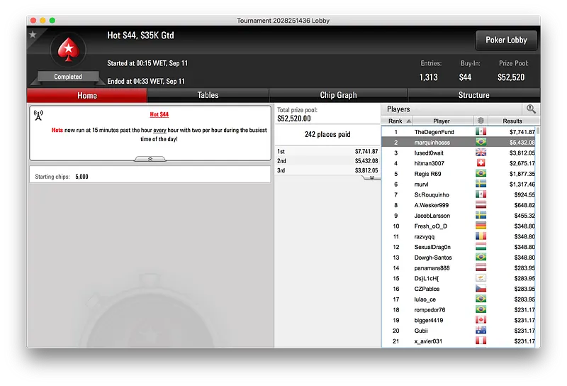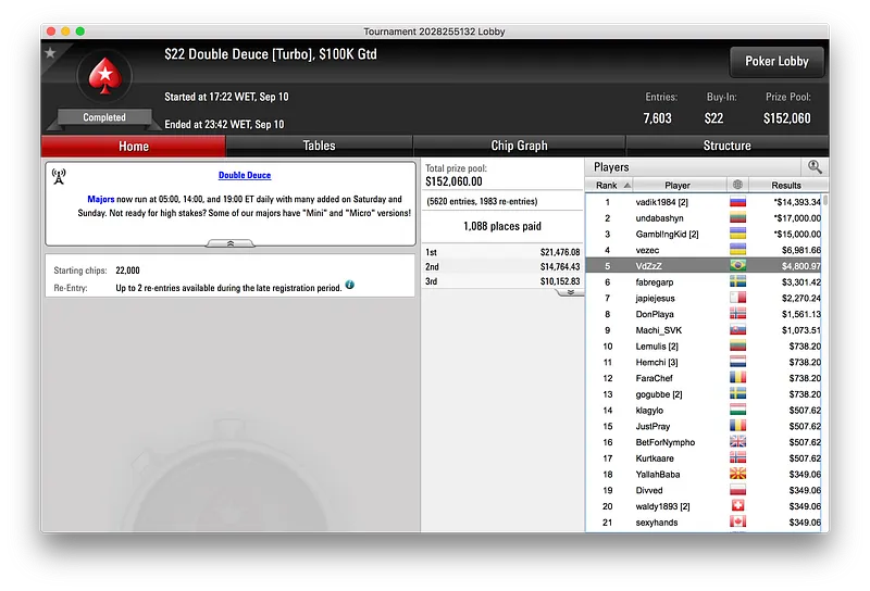 E medalha de bronze ficou no pescoço de _WaPetry_ que foi vice-campeão do $109 Sunday Cooldown e recebeu $17.163. Apenas o Austríaco neeno1990 se conseguiu opôr ao Brasileiro e acabou por vencer o torneio. Na mesa final estiveram também PaDiLhA SP (3º - $12.455) e bubbleboybr (4º - $9.038).