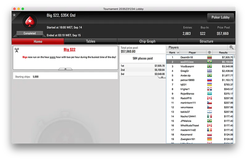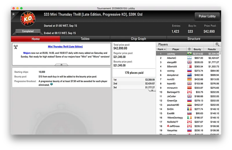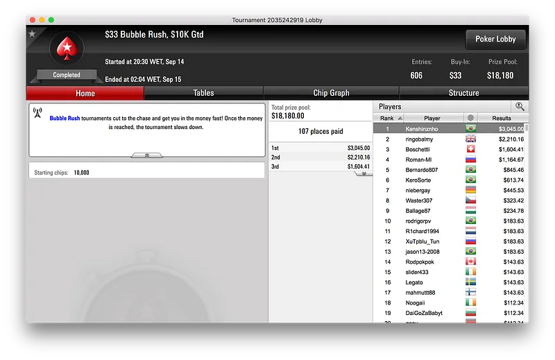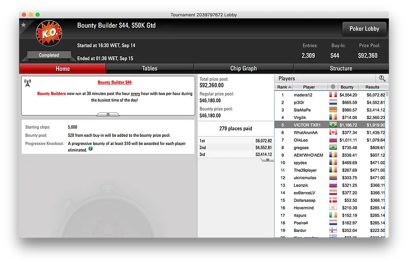 O terceiro lugar do pódio ficou ocupado por Pinganemim2, o grande vencedor do Bounty Builder $33. O Brasileiro derrotou o field composto por 2.902 entradas e embolsou a maior fatia do prize pool de $87.060. No final, Pinganemim2 bateu BadBeatPls heads-up e adicionou $9.142 na conta.