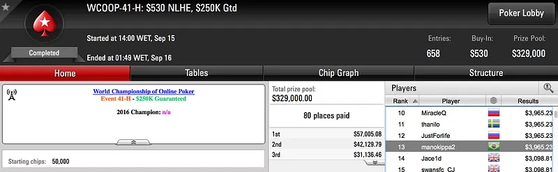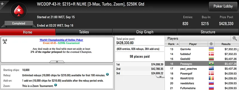O grande destaque vai para guicosta94 que cravou o Evento #34-L: $55 NLHE [8-Max]. O torneio contou com 6.040 entradas o que resultou num prize pool de $302.000. A mesa final foi invadida por Brasileiros e 4 dos 8 jogadores eram canarinhos. PDM Sep (7º - $5.126), Hand of D00m (6º - $7.304) e flagazzi (4º - $14.833) foram caindo enquanto guicosta94 se manteve na luta até ao final e acabou mesmo saindo com a medalha de ouro ao pescoço acompanhada do prêmio de $42.922 que estava reservado para o campeão.