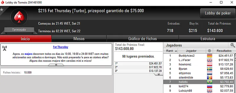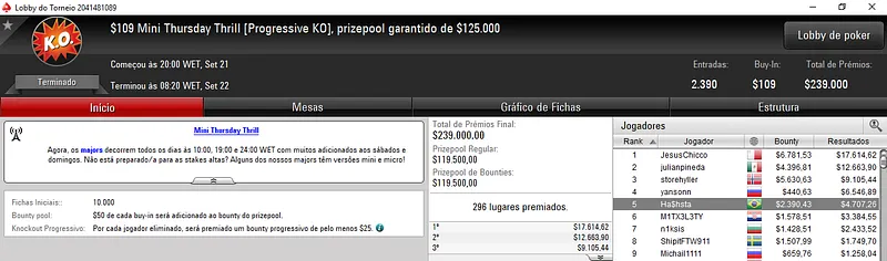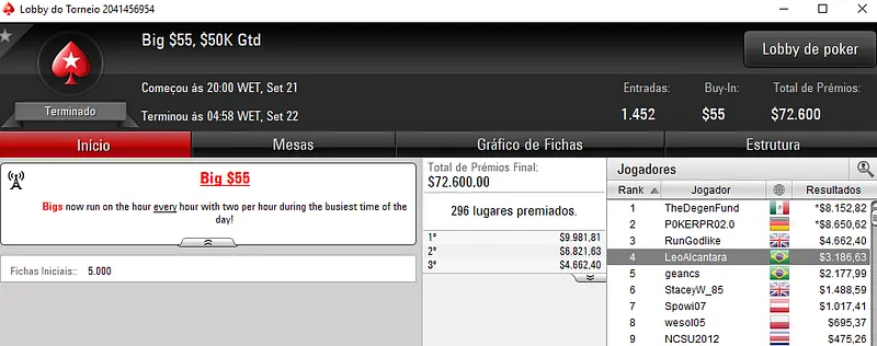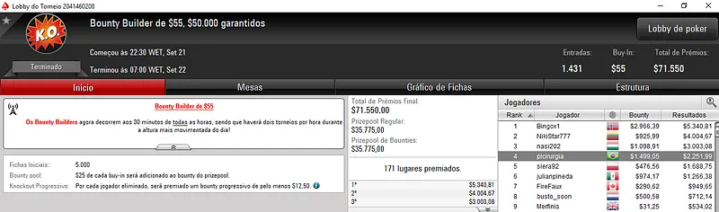 Quem também deu uma bela cravada foi DelPane no Bounty Builder $33. O jogador brasileiro superou 2,934 oponentes para encaixar $8,687. O heads-up foi disputado contra outro brasileiro. GuGuGFBPA recebeu $4,271 na segunda colocação.