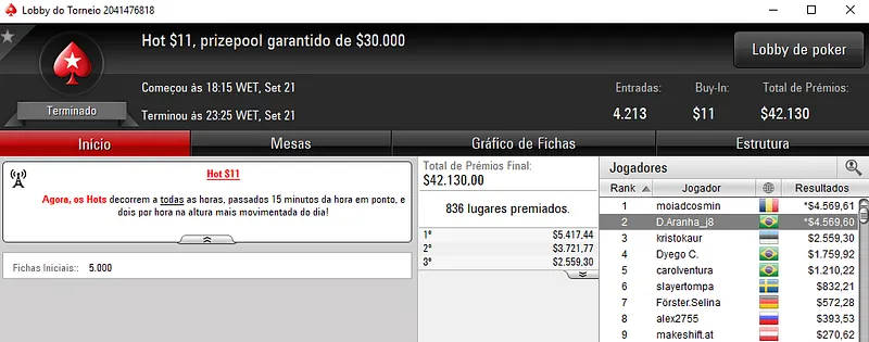 Ontem, Pedro "kurtWSOP" Cavalieri foi a estrela dos girnders online ao cravar o Hot $215 com 413 jogadores. O torneio teve um prize pool de $82,600 e para o caixa do craque veio $13,658 depois de fazer acordo no heads-up com o russo "Don_Caroli0ne".