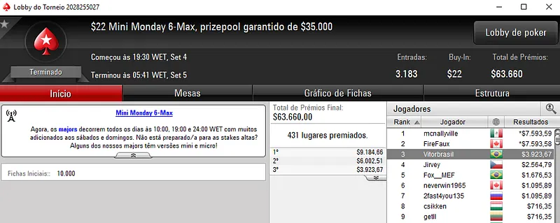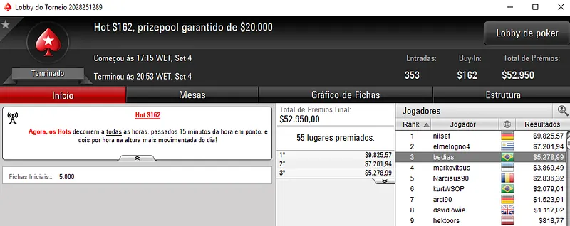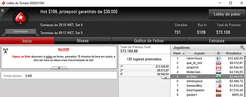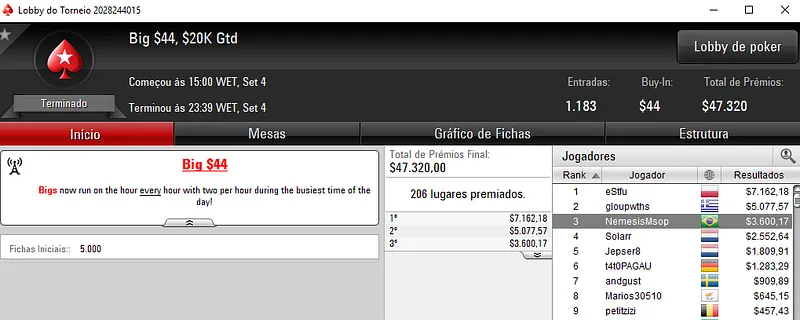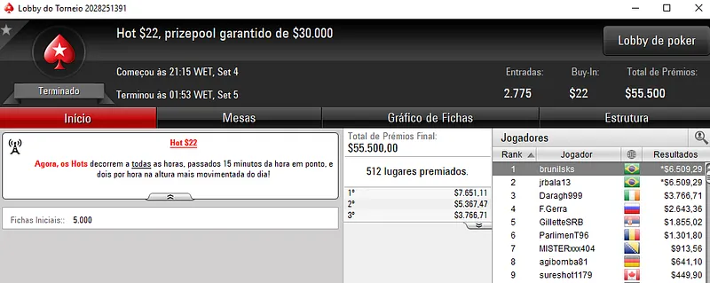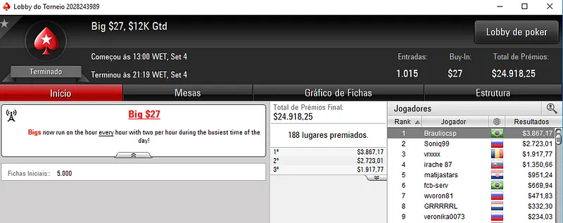 Pedro "PaDiLhA SP" Padilha foi quem mais forrou nesta reta. O jogador de São Paulo cravou o Bounty Builder $109 com 1,764 oponentes para receber $24,385 de premiação. Na segunda colocação, TheGalitoz forrou $10,961.