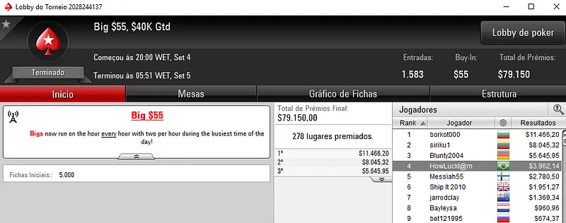 Já no Bounty Builder $44 com 2,580 jogadores, 77portuga cravou $11,193 depois de soltar o grito neste torneio.