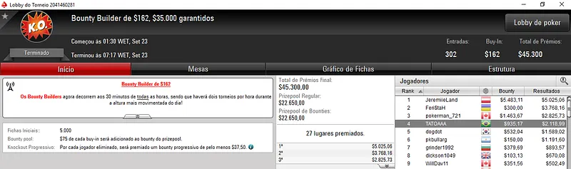 A terceira maior forra do dia veio pelas mãos de GiveMeTwOutS, que encaixou $5,703 depois de terminar o Bounty Builder $33 na segunda colocação. Este torneio contou com 3,111 participantes.