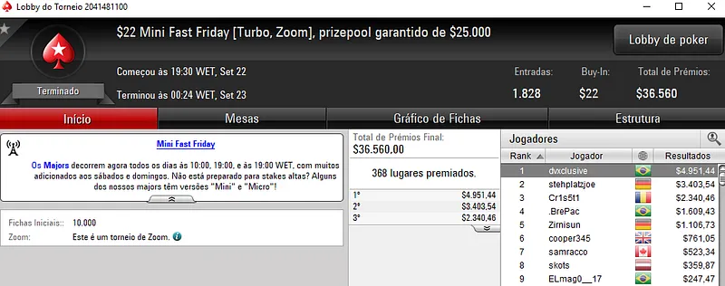 Um desses jogadores foi Pedro "PaDiLhA SP" Padilha que cravou o $215 Fast Friday [Early Edition, Tubo, Zoom], onde participaram 446 jogadores. O craque fez acordo no heads-up com o belga "baaftje01" e terminou faturando $14,777 de premiação.