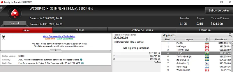 Antes, já André Akkari tinha embolsado $13,452 pela 4ª colocação no Evento #75-Low. O torneio contou com 354 jogadores e André mostrou as suas habilidades nas diferentes variantes de poker. Bernardo "bedias" Dias ficou perto da mesa final e recebeu $3,894 no 7º lugar.