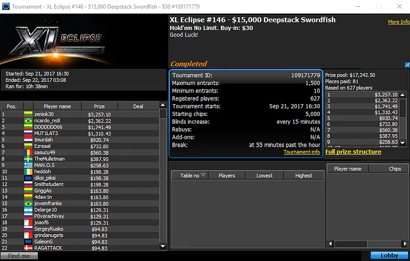 O título apareceu no Evento #143 - $5,000 Turbo Americas com 85 jogadores. O jogador brasuca DibreBruxo cravou $1,485 e o título neste torneio.