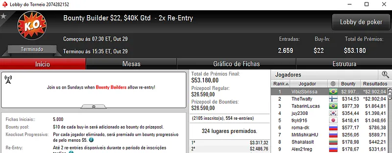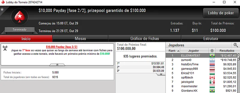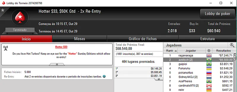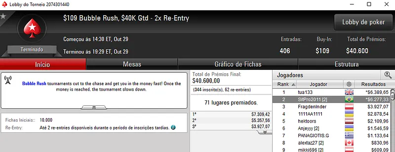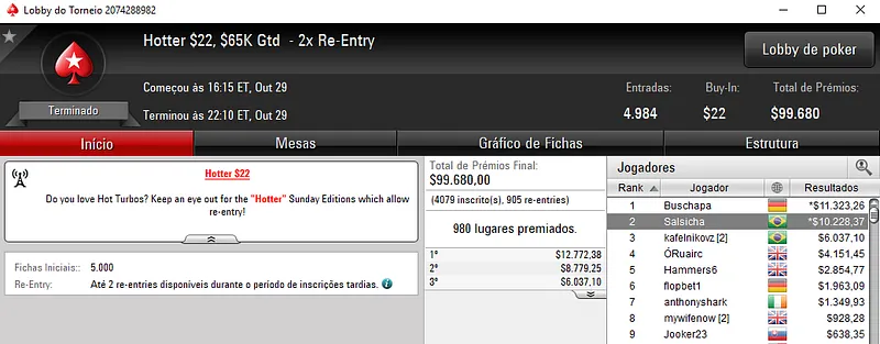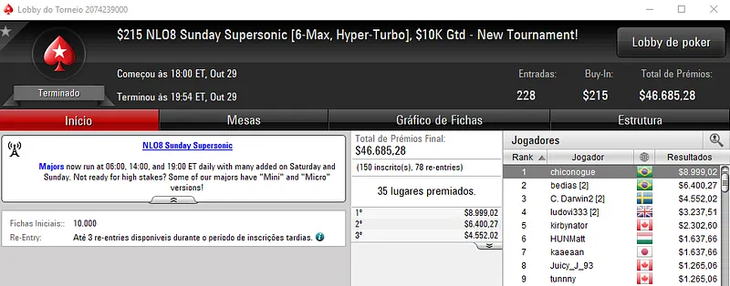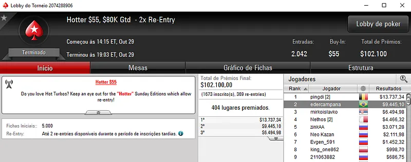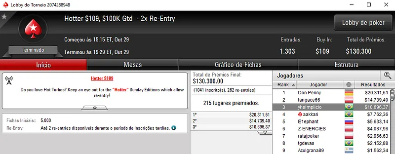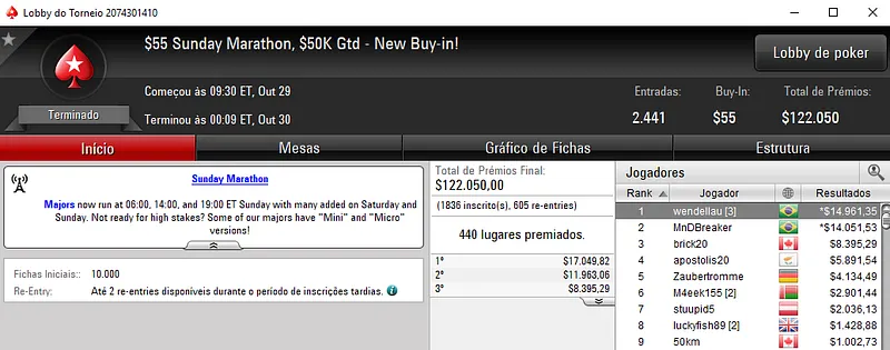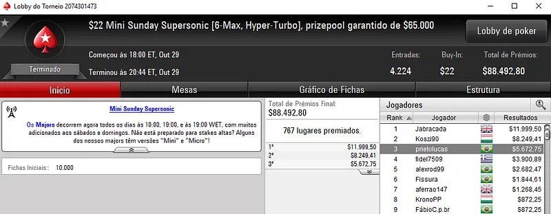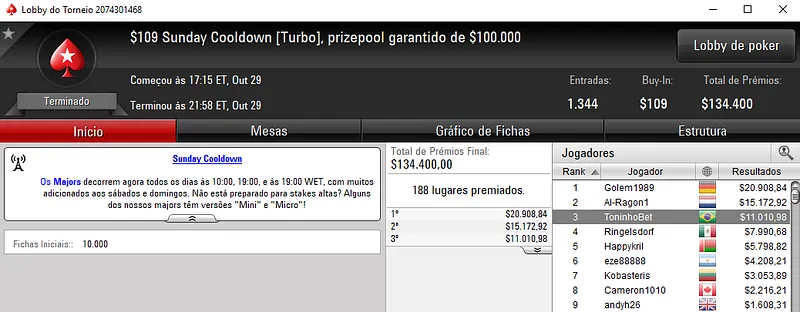 Já na versão mini do Sunday Million, o $22 Mini Sunday Million registrou 10,203 entradas. O campeão zola160 destruiu o field e cravou $17,403.