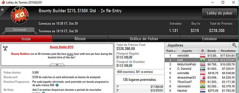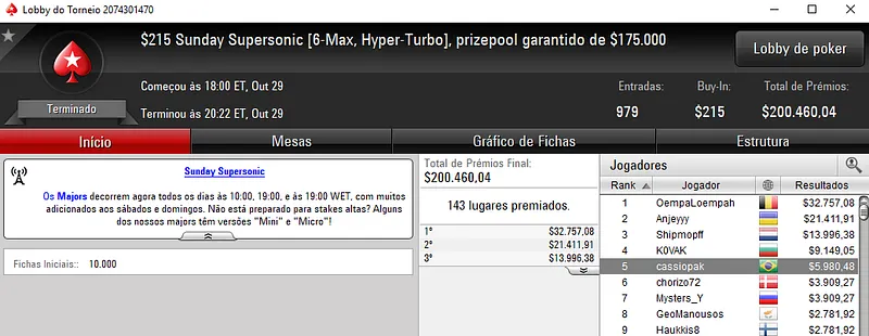 No novo torneio do PokerStars, o $2,100 Super High Roller teve a participação de 173 jogadores e allinefm87 saiu com uma grande forra. O jogador brasileiro faturou $30,840 depois de perder na quarta colocação.