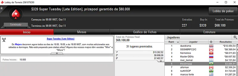 Os grinders brasileiros saíram ontem com grande conquistas do PokerStars. Além dos resultados obtidos no $1,050 Super Tuesday, mais jogadores saíram com premiações de 5 dígitos da maior sala de torneios de poker do mundo.