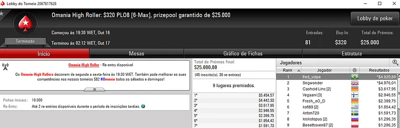 Ganbingola também deu show e soltou o grito no Big $11 com 4,468 jogadores e $44,680 de prize pool. O jogador brasileiro embolsou $5,739 depois de vencer Romazio no heads-up.