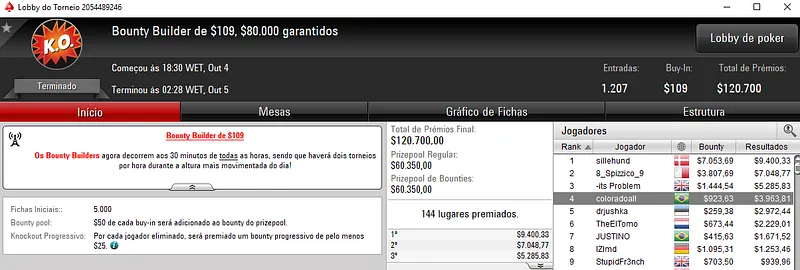 Bruno "bubbleboybr" Severino foi o grande vencedor da ret ao conquistar o Bounty Builder $162. Este torneio teve a presença de 324 jogadores, onde Bruno embolsou $10,451 ente prêmio e bounties.