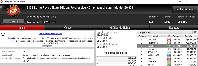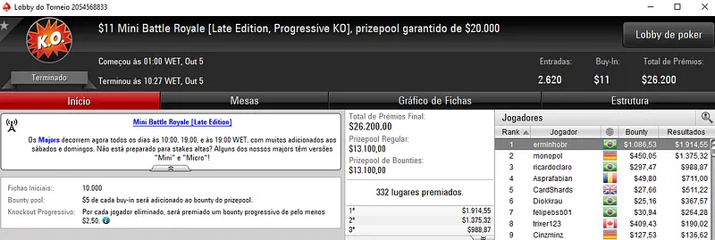 Já no Big $55 com 1,117 jogaodres houve samba no pódio. HowLuckI@m e Vinicius "vinifenomeno" Teles fizeram a dobradinha no torneio e dividiram os prêmios no 4-handed. HowLuckI@m cravou $4,144, enquanto Vinicius levou para o caixa $5,891.