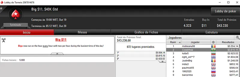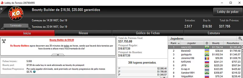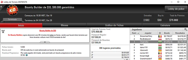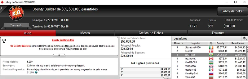 João "JP_Braga81" Braga foi um desses jogadores ao cravar o Bounty Builder $109 com 1,2001 participantes. O jogador brasuca passou por cima de toda a concorrência e trouxe para a sua conta $14,822 de premiação.
