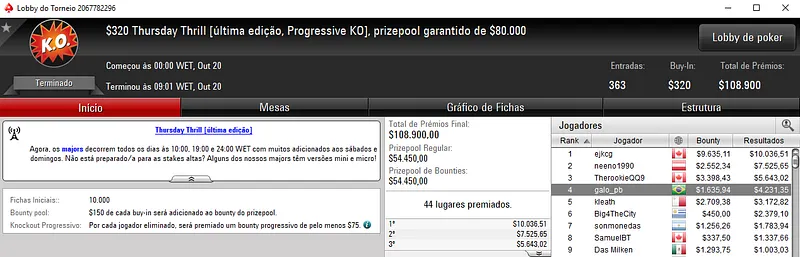 Já Renato "bauruzito" Valentim conseguiu chegar na mesa final do $1,050 Thursday Thrill com 428 participantes. O craque ficou perto de uma grande conquista mas caiu na 5ª colocação para receber $13,103 entre prêmio e bounties.