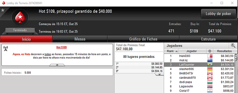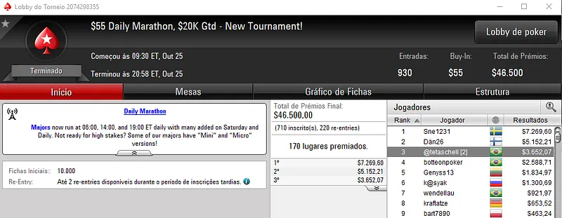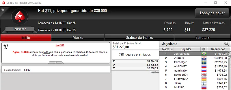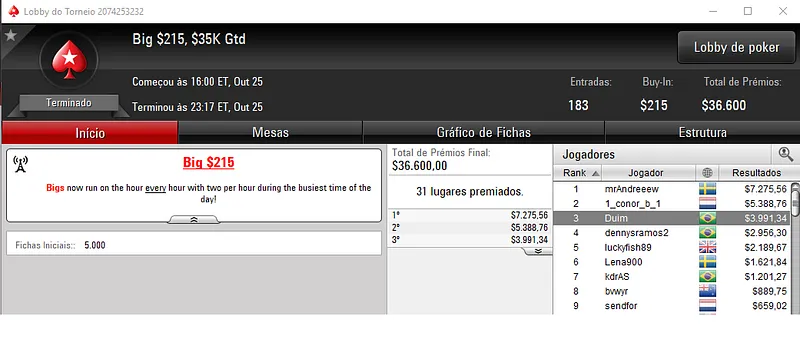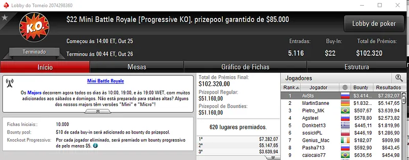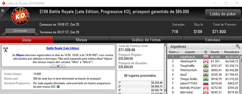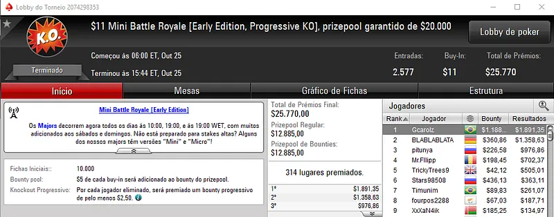 Quem também se deu bem foi Tripaozao que forrou $6,320 entre prêmio e bounties no $109 Battle Royale [Early Edition]. Este torneio contou com 506 jogadores e na terceira colocação leo_nando90 recebeu $3,125 de premiação.