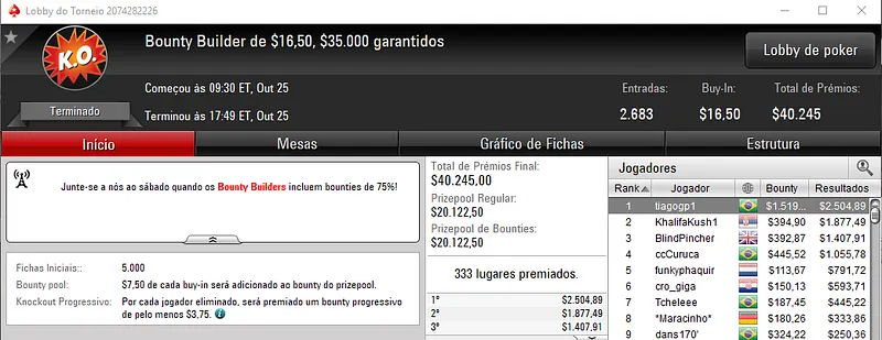 Já _maik1nz foi o campeão do Bounty Builder $11 com 5,937 jogadores. O jogador verde e amarelo levou para o caixa $4,828 de premiação.