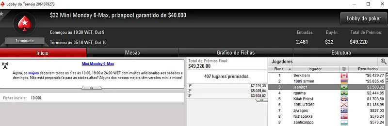 Primeiro, Pablo Foi vice campeão no $215 Monday 6-Max com 462 participantes. O jogador brasileiro perdeu no heads-up com o sueco banne1992 e faturou $13,546 depois de ter feito acordo. Pedro "gusmaa" Madeira terminou em quarto e recebeu $5,733 e Diogo "offQbert45" Ferreira faturou $4,031 na quinta colocação.