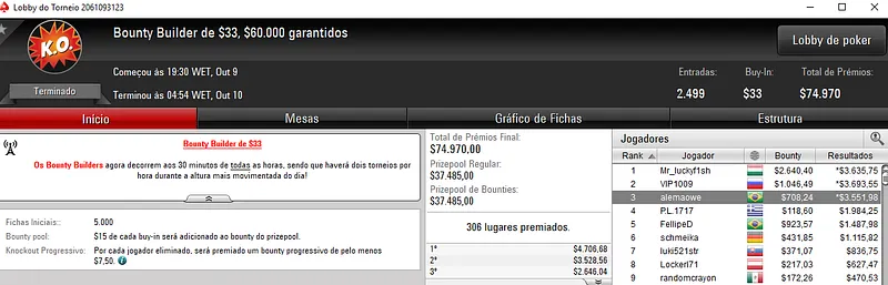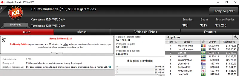 Drudz777 também trouxe uma medalha de ouro. Ele conquistou o Bounty Builder $44 onde participaram 1,824 jogadores. Depois de bater esse field, Drudz777 embolsou $8,797 de premiação.