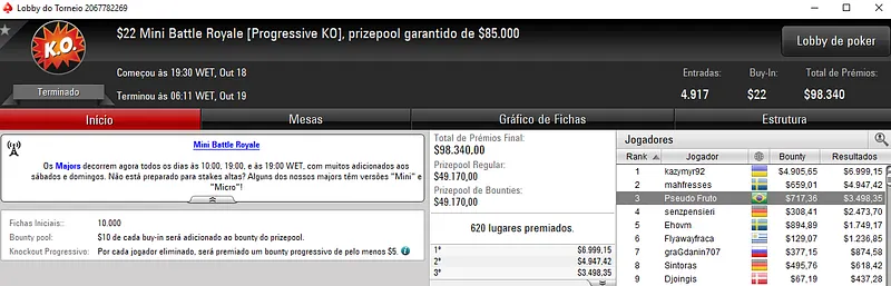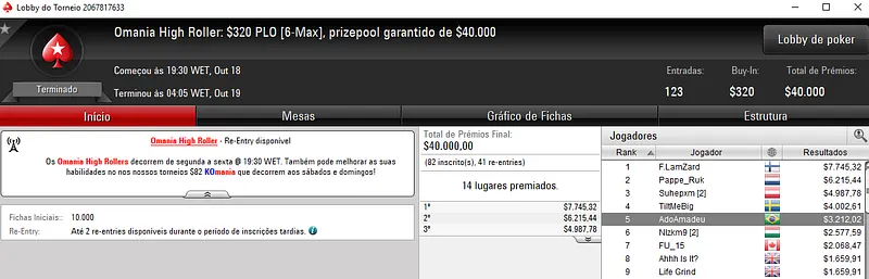 Já Adrovan "AadrovanRj21" Rodrigues conseguiu terminar o Bounty Builder $215 na terceira colocação. O seu desempenho no torneio com 386 jogadores valeu $6,298 de prêmio.