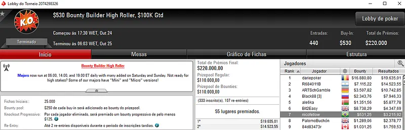 O novo torneio $530 Daily 500 registou 204 entradas e o jogador verde e amarelo reyleon2005 saiu com $8,221 de premiação depois de terminar na 4ª colocação.